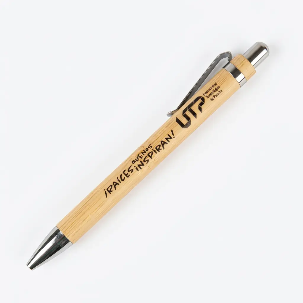 Este elegante bolígrafo está fabricado en bambú natural, un material sostenible que aporta un estilo cálido y orgánico. Su diseño incluye un grabado personalizado del logo de la UTP, representando el orgullo institucional y el compromiso con el medio ambiente.