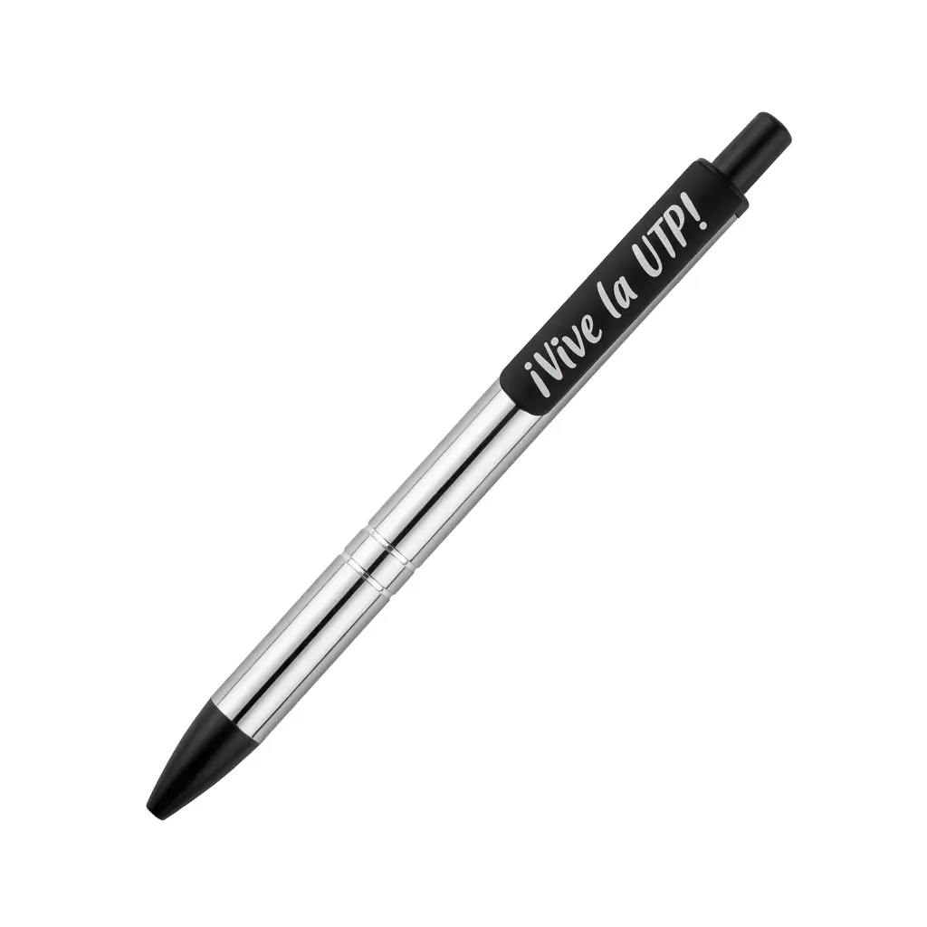 Boligrafo retractil plateado con punta color negro, estampado “Vive la UTP”.
