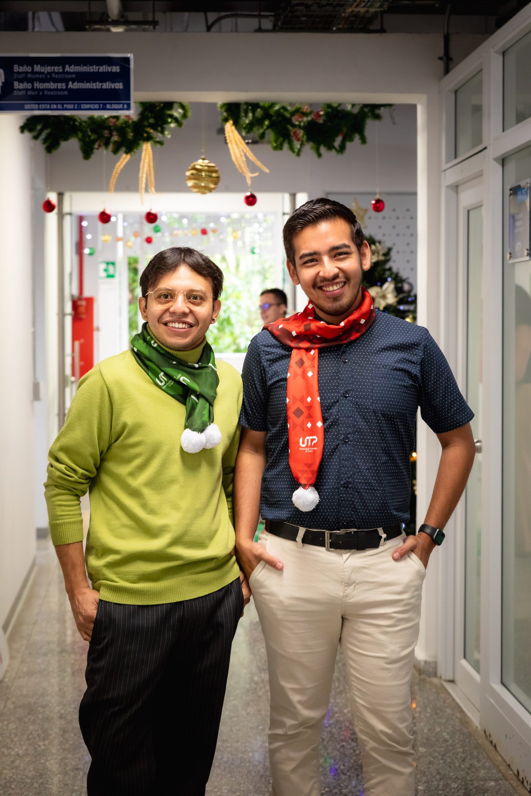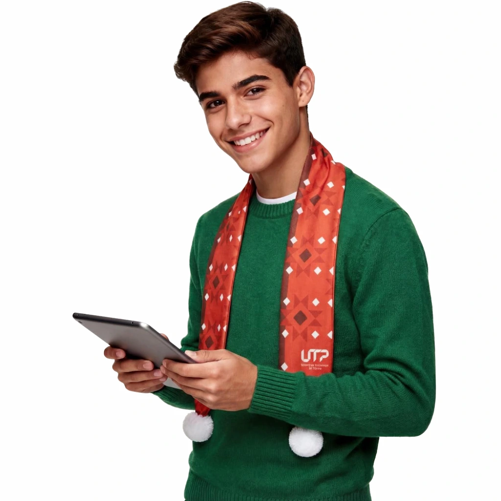 Nuestra bufanda navideña UTP combina el espíritu festivo con la identidad institucional en un accesorio único, cálido y llamativo. Está elaborada en tela suave y ligera, ideal para acompañar las celebraciones decembrinas sin generar calor excesivo. Su diseño está disponible en dos estilos: uno en tonos verdes con patrones de pinos y figuras geométricas, y otro en rojo con motivos navideños estilizados, ambos decorados con el distintivo logo de la Universidad Tecnológica de Pereira.