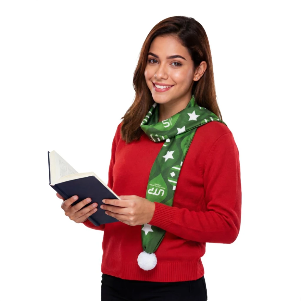 La bufanda cuenta con un borlón blanco esponjoso en cada extremo, aportando un toque alegre y tradicional propio de la temporada. Su estampado de alta calidad garantiza colores intensos y una apariencia moderna, perfecta para actividades institucionales, eventos, regalos corporativos o simplemente para lucir espíritu navideño con identidad universitaria.